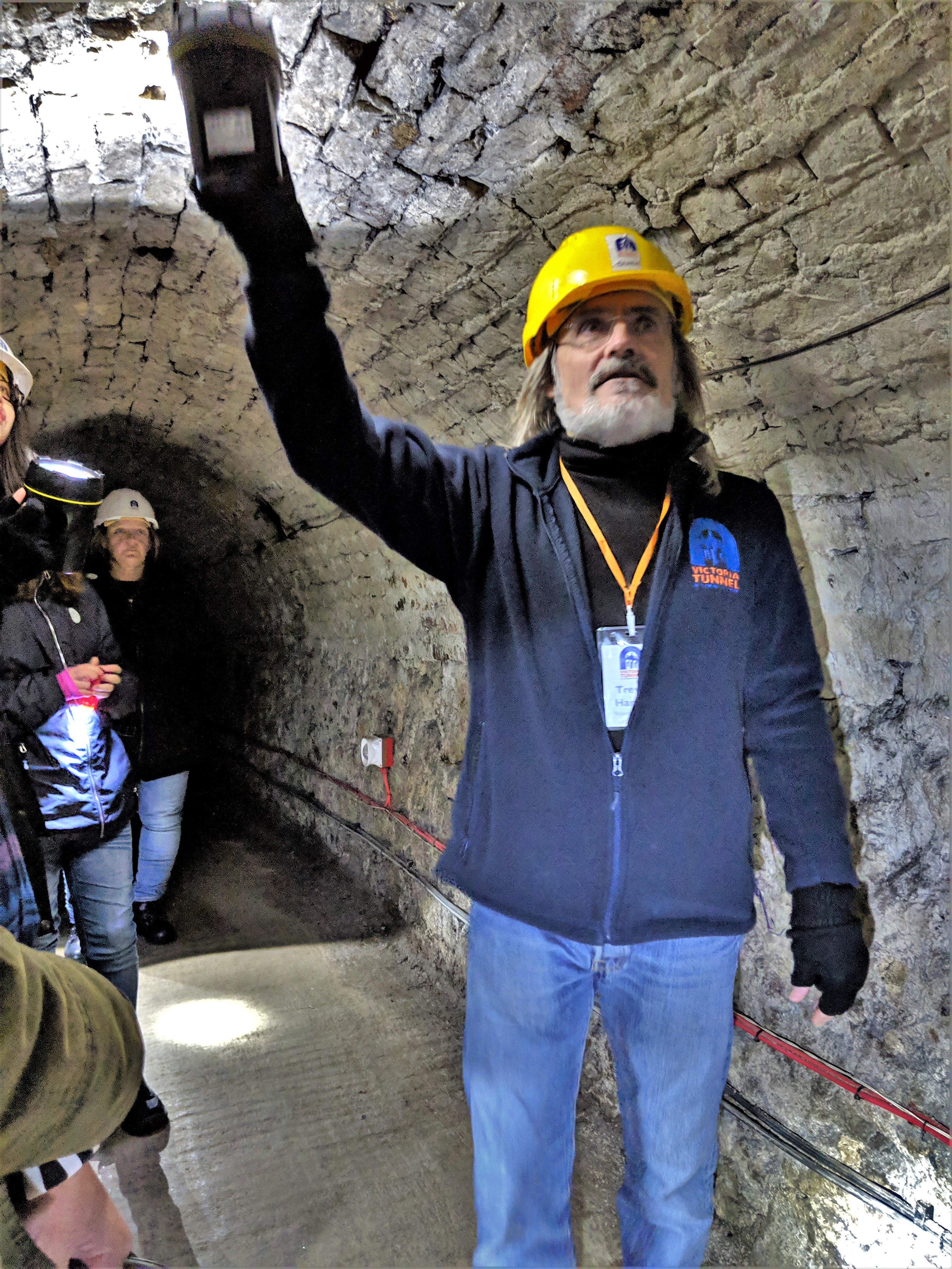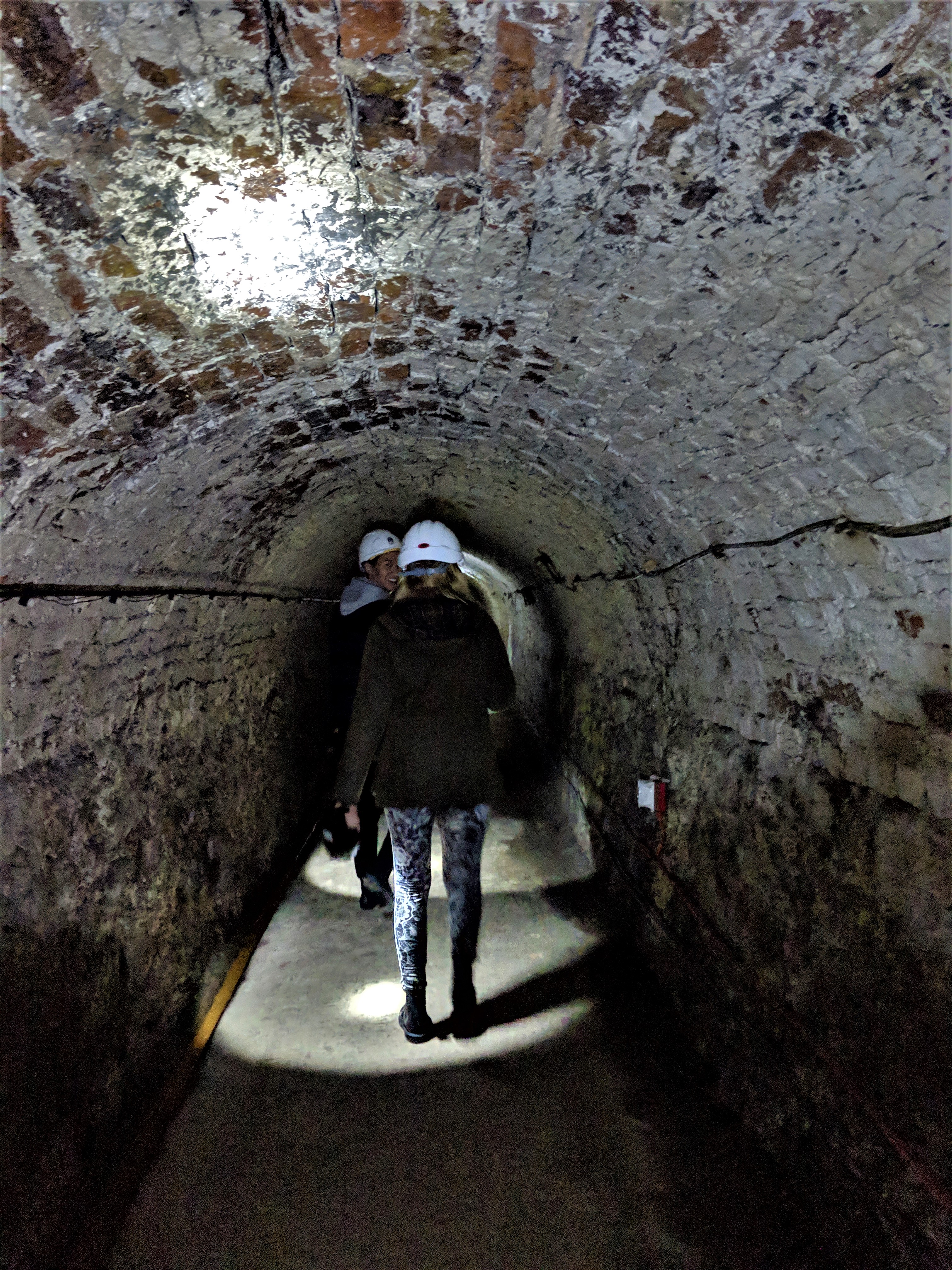 Outfitted with hardhats and ‘torches’, our guides led us into the depths of the brick-arched tunnel, giving us a close up look at its construction and original use, including a true ghost story about the death of a potential buyer when it was abandoned in 1860. The return journey from 26 meters below the surface focused on the tunnel’s conversion and use as an air raid shelter during World War II and its partial collapse and restoration some many years later.